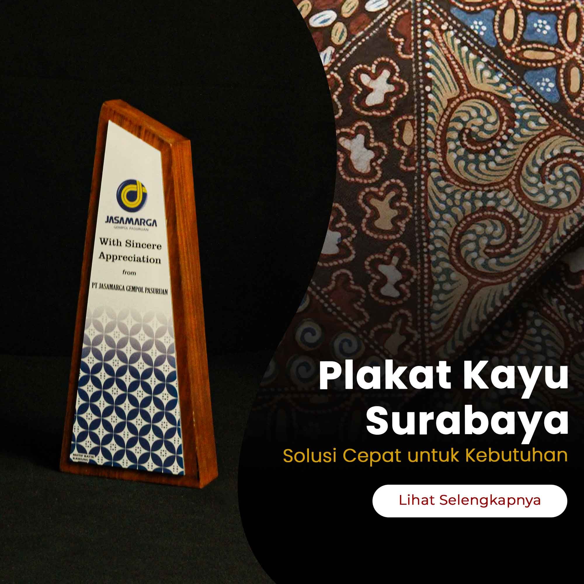 Plakat kayu Surabaya merujuk pada produk plakat berbahan dasar kayu yang diproduksi oleh vendor di wilayah Surabaya. Produk ini biasanya digunakan sebagai media penghargaan, kenang-kenangan, atau simbol apresiasi dalam berbagai acara.